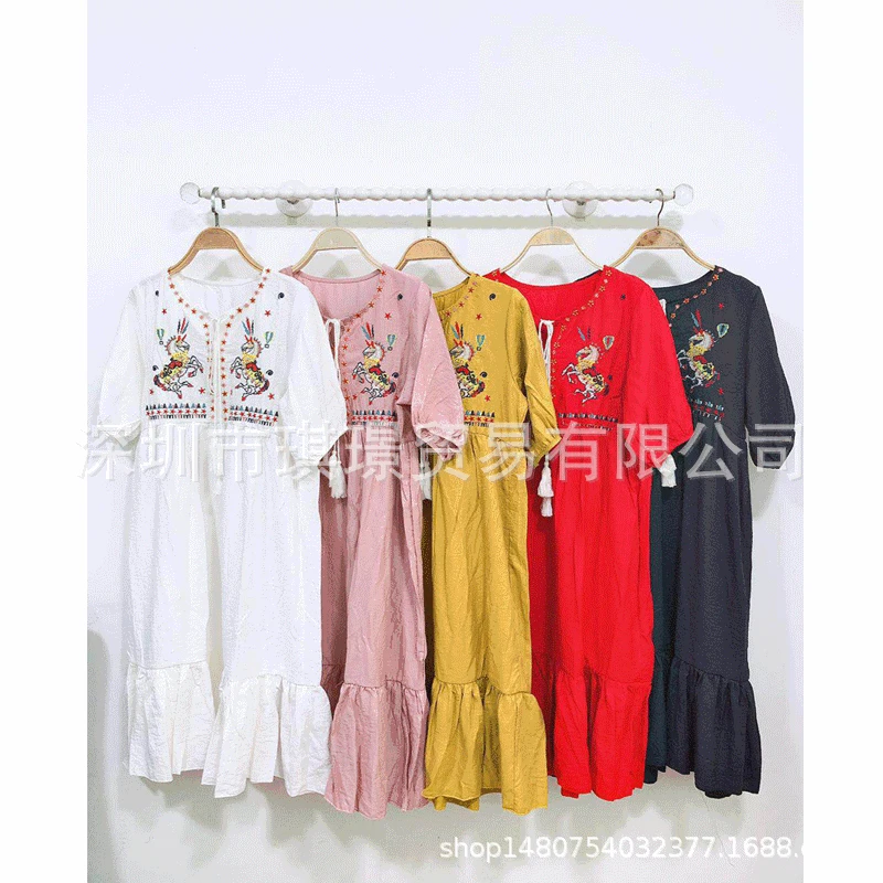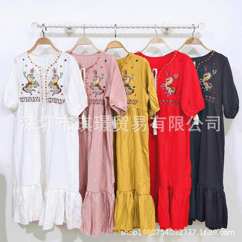 Spring And Summer Small White Horse Embroided Dress Women's Flounced Hem Loose-Fit National Wind Mo